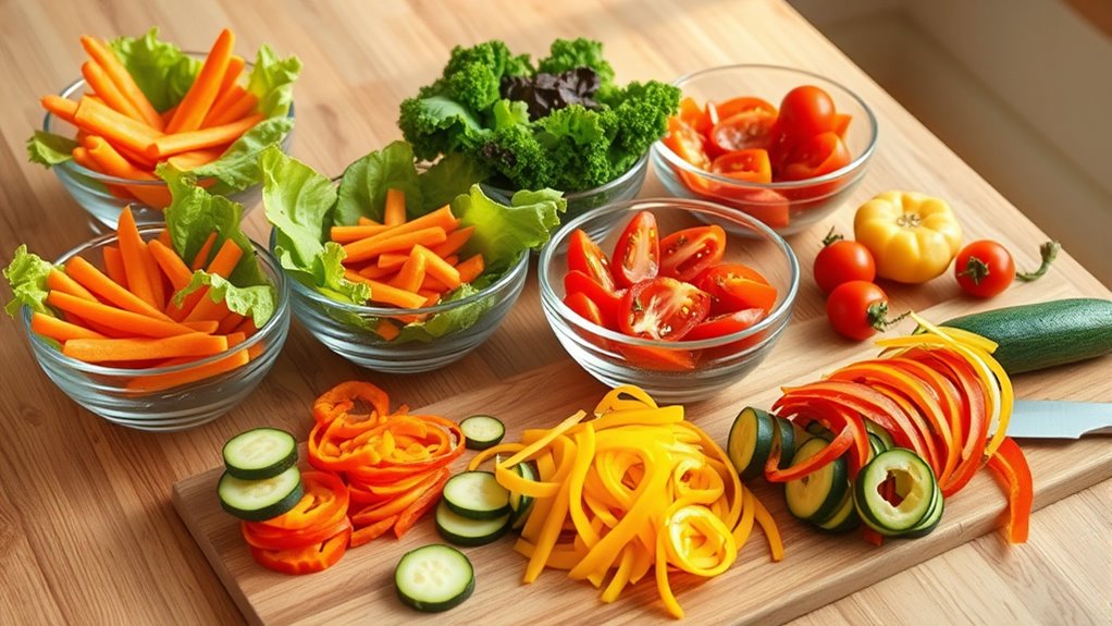 Think of your kitchen as a raw food symphony—blender essentials and mandoline slicers are your conductors. The blender blends vibrant smoothies and creamy sauces, while mandoline slicers slice vegetables with precision and flair. These tools turn simple ingredients into artful dishes, making prep swift and effortless. With them, you’re equipped to craft colorful, nutritious meals that keep your raw food journey exciting, fresh, and full of flavor.