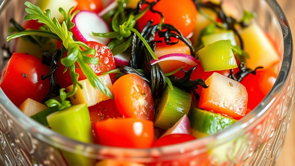To make plant-based ceviche with sea vegetables, start by chopping ingredients like kelp, wakame, or nori into small pieces. Marinate them in lime or lemon juice to absorb the tangy flavors, allowing their texture to become chewy and slightly crunchy. Add fresh herbs, diced tomatoes, onions, and optional spices for complexity. Using sea vegetables not only mimics seafood’s taste and texture but also boosts nutrition. Keep exploring to discover more flavorful tips and variations.