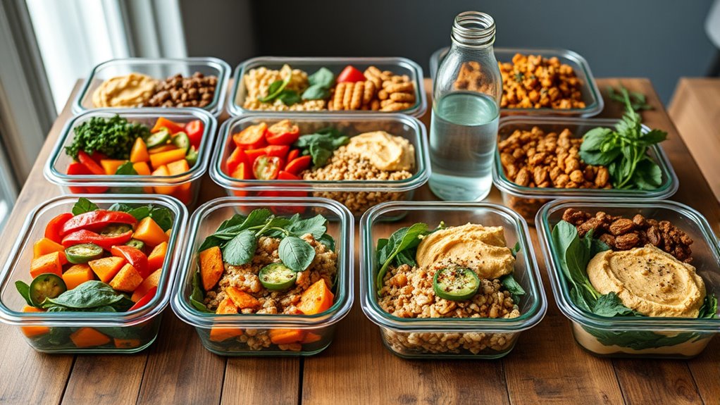 To make busy weeknights easier with plant-based meal prep, plan ahead by batch-cooking grains, proteins like lentils or tofu, and pre-chopping vegetables. Keep versatile ingredients on hand and store them in clear containers to streamline your process. Prepare snacks in advance to avoid temptation and focus on simple, flavorful meals that come together quickly. If you keep these tips in mind, you’ll find weeknights become much less stressful—stay tuned for more ideas to optimize your routine.