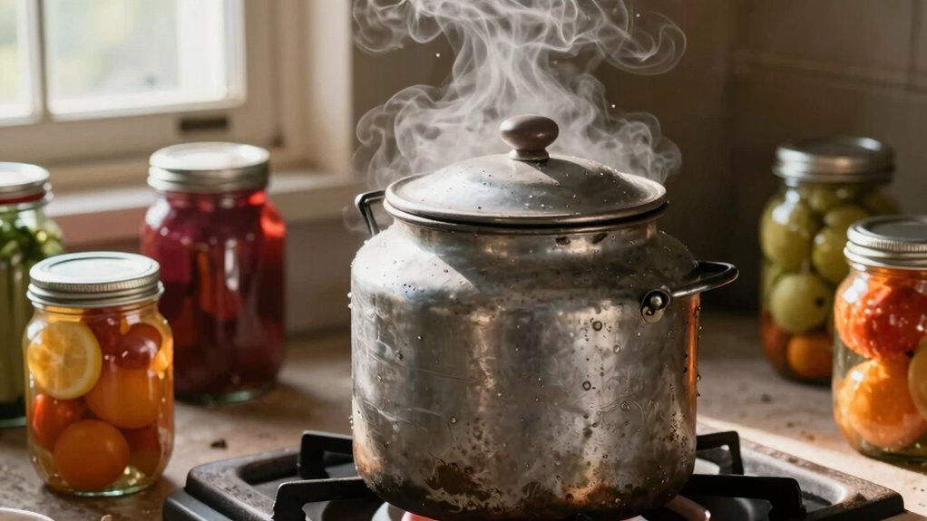 Think of your pressure canner as a trusted ship—if it’s failing, it risks sinking. Signs include steam leaks, a gauge that won’t stabilize, or unusual noises during operation. Regular pressure canner maintenance is essential for safety. Follow canning safety tips diligently, and if you notice any of these signs, stop using the canner immediately and get it inspected or replaced. Trust your equipment to keep your canned goods safe.