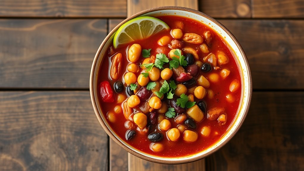 When you’re ready to serve, top your chili with fresh herbs like cilantro or green onions, and perhaps a squeeze of lime for brightness. This finishing touch brightens the dish and balances the hearty spices. If you want to spice things up, serve it with hot sauce or sliced jalapeños on the side. Remember, customizing your spice combinations is key—adjust the heat level and seasonings according to your taste. For meal prep, portion out servings into individual containers, and store in the fridge for up to four days. Reheat thoroughly before eating, and consider adding a dollop of plant-based sour cream or avocado slices for extra creaminess. This vegan chili isn’t just a meal; it’s a comforting, nutrient-packed bowl that keeps you warm and energized through even the coldest nights.