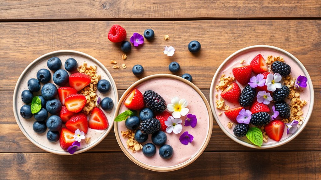 The beauty of smoothie bowls with berries lies in their versatility and ease of customization. You can experiment with different toppings—granola, coconut flakes, or a drizzle of honey—to keep things interesting. Plus, they’re an excellent way to incorporate more fruits and vegetables into your diet seamlessly. Since berries are naturally sweet, you won’t need excess added sugars, making your breakfast healthier. The combination of fiber, antioxidants, and healthy fats helps keep you full longer, stabilizing your blood sugar and preventing mid-morning crashes. Incorporating superfoods into your bowls can further enhance their nutritional value and support your wellness goals.