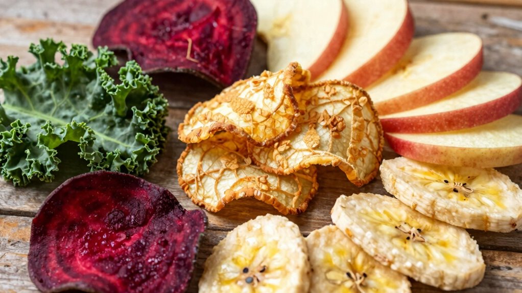 Now that you know how to dehydrate fruits and veggies like a pro, your snacks will taste as vibrant as a garden in full bloom. Avoid blandness by seasoning well and setting your dehydrator just right. Think of your snacks as a canvas—your flavor combinations and techniques are the paint. With these tips, you’ll turn simple ingredients into crispy, flavorful treats that don’t taste like cardboard, making healthy snacking a delicious adventure.