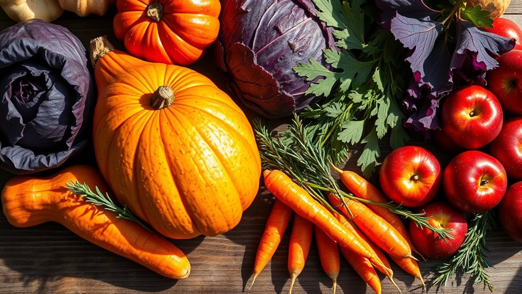 During fall and winter, root vegetables like carrots, parsnips, and sweet potatoes become your best friends. They’re versatile, filling, and perfect for hearty stews or roasted as side dishes. Incorporate squash varieties such as butternut or acorn into your meal prep to add sweetness and texture to your dishes. Leafy greens like kale and collard greens also thrive in colder weather, providing a nutritious boost to your recipes. These ingredients are ideal for making nutritious, easy-to-prepare soup recipes that warm you up on chilly days. Think of blending roasted butternut squash with spices for a creamy soup or simmering kale with beans and garlic for a hearty, veggie-packed broth. Hearty stews become even more satisfying when you include seasonal produce—think beef or vegetable stews loaded with carrots, potatoes, and celery, simmered to perfection.