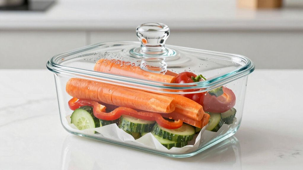 Storing cut veggies with water can keep them crisp, but it’s not always the best choice. For ideal freshness, dry your cut veggie prep thoroughly and store in an airtight container with a damp paper towel. This prevents excess moisture, which can cause spoilage. Use these storage tips to maintain crunch and freshness all week, ensuring your veggies stay crisp and ready to enjoy.