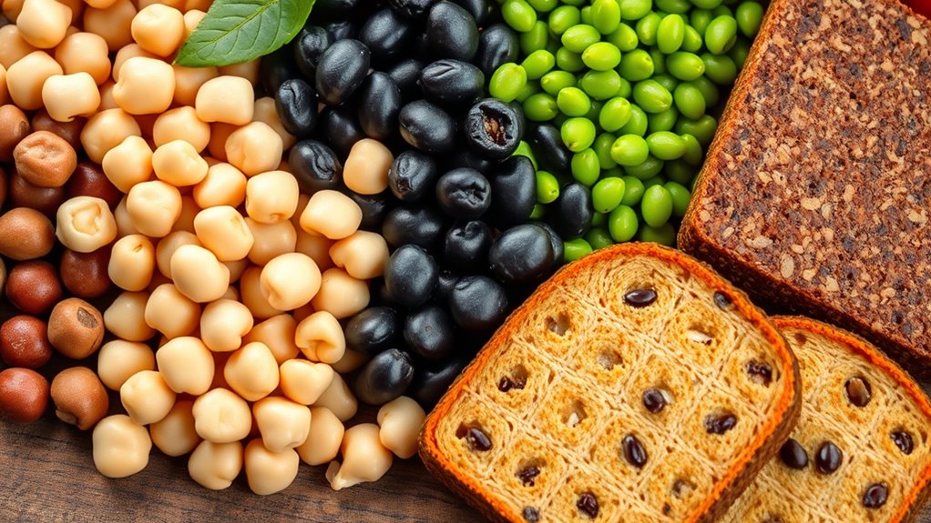 Plant-based proteins go well beyond tofu, offering a variety of nutritious options like beans, lentils, chickpeas, and peas, each with unique benefits. These options are sustainable, affordable, and easy to prepare, while also boosting your diet with essential vitamins, minerals, and fiber. Pairing grains with legumes can create complete proteins, making your meals both satisfying and balanced. Keep exploring to discover how these versatile foods can enhance your plant-based diet.