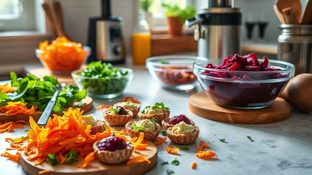 Flavor pairing becomes an essential skill when transforming juice pulp into snacks. Different fruit and vegetable pulps carry unique flavors and textures, so understanding how to combine them enhances your culinary creations. For example, apple pulp pairs beautifully with cinnamon or ginger, creating warm, inviting flavors. Mango pulp works well with coconut or lime, giving your snacks a tropical twist. When you experiment with flavor pairing, you’re tailoring snacks to your taste preferences while also boosting their nutritional profile. Combining pulp with nuts, seeds, or dried fruits can add crunch, protein, and natural sweetness, making your homemade snacks more satisfying and balanced. Additionally, incorporating high-fiber ingredients like chia seeds can further improve the texture and nutritional value of your creation.