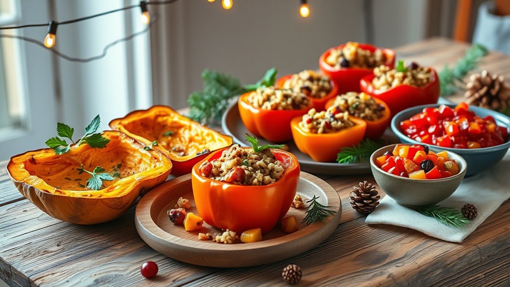 Discover a vibrant vegan holiday menu that fits every season. Start with colorful veggie platters, stuffed mushrooms, or crispy chickpeas for festive appetizers. For mains, try a hearty vegan roast or stuffed squash paired with seasonal sides like roasted vegetables and cranberry sauce. Don’t forget indulgent desserts such as pumpkin cheesecake or apple crisp, and festive drinks infused with ginger or citrus. Keep exploring to craft a celebration that’s delicious, beautiful, and full of seasonal flavors.