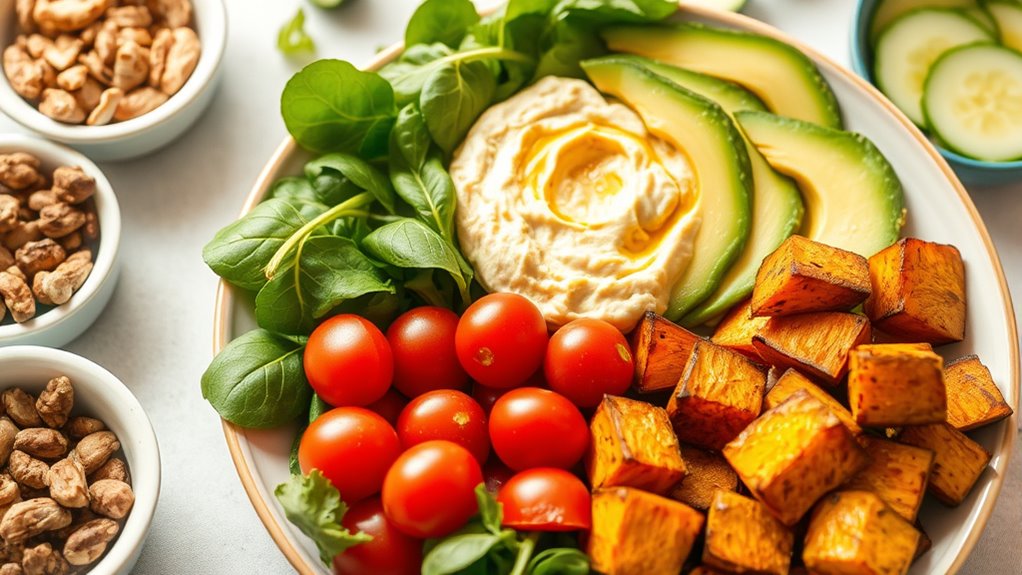 A well-designed vegetarian meal plan can help you manage weight while improving your health. Focus on incorporating nutrient-dense plant foods like beans, lentils, tofu, and plenty of colorful vegetables. Planning and prepping meals ahead of time guarantees balanced portions, variety, and satisfaction. Using strategies like batch cooking and including healthy fats helps keep you full and prevent overeating. Keep your meals flavorful and interesting, and you’ll stay motivated on your journey—more tips to come.